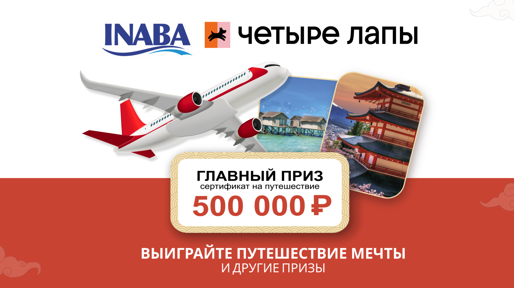 С 1 ноября INABA совместно с сетью зоомагазинов «Четыре лапы» запускает масштабную акцию с невероятными призами. Целый месяц вас ждут еженедельные розыгрыши, гарантированные подарки и главный приз — сертификат номиналом 500 000 рублей на путешествие вашей мечты!
